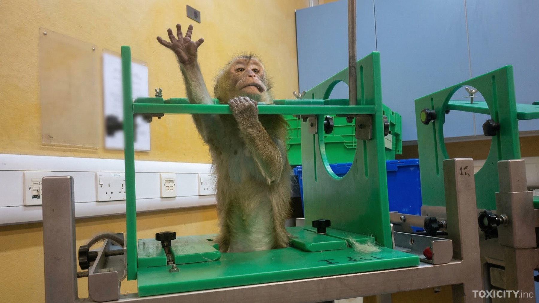 Ces animaux sont soumis à de terribles souffrances : enfermés dans des cages, ils sont contraints de subir des tests extrêmes qui peuvent entraîner leur mort. À l’issue des tests, les animaux qui survivent sont euthanasiés. Les tests présentés dans ces images servent à évaluer des médicaments, mais certains d’entre eux peuvent également être nécessaires pour des produits chimiques industriels, des pesticides ou des additifs alimentaires.
