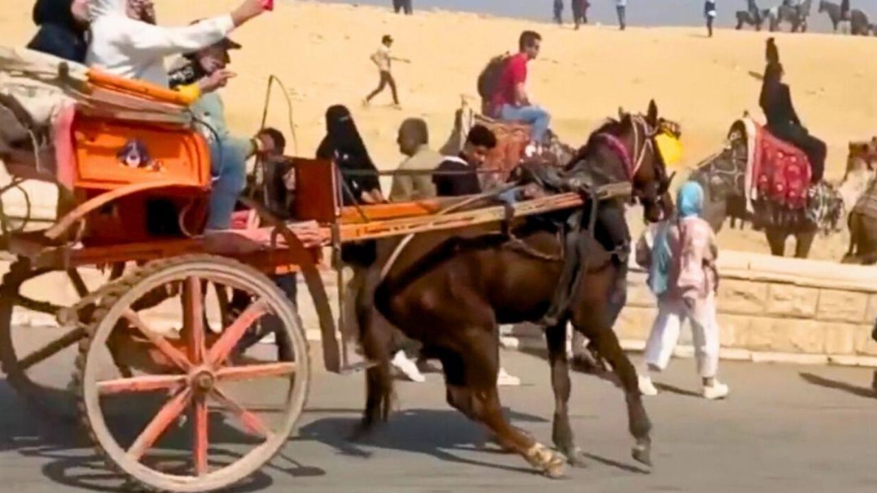 Pourtant, à quelques centaines de mètres de ce symbole de civilisation, une autre réalité, cruelle et ignorée, se joue. Dans les zones touristiques autour des pyramides, des chevaux de calèches et des chameaux sont soumis aux pires formes d’exploitation. Sous un soleil accablant, épuisés, affamés et maltraités, ils transportent sans relâche des touristes avant d’être abandonnés, parfois jusqu’à la mort.