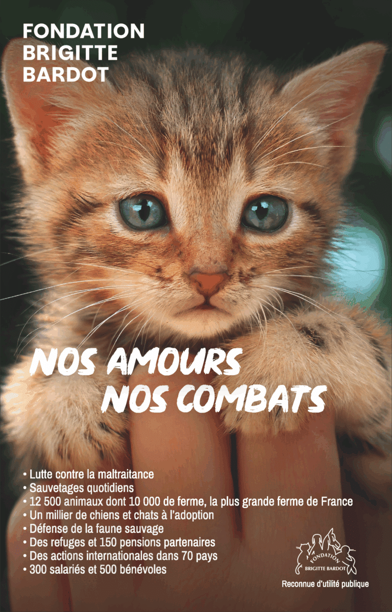 La Fondation Brigitte Bardot est fière de lancer le 21 novembre sa nouvelle campagne institutionnelle : « Nos amours Nos combats » ! Cette nouvelle campagne démarre aujourd’hui dans en pleine page dans la presse française : Le Figaro, le JDD, Var Matin, Nice Matin, La Provence, Ouest France, Le Parisien, La Dépêche du Midi, Paris Match, la Voix du Nord…